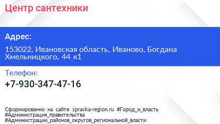 Центр сантехники по адресу 153022, Ивановская область, Иваново, Богдана Хмельницкого, 44 к1 в дальнейшем Организация, размещена в следующих категориях: