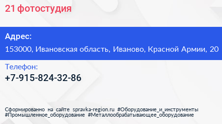 21, фотостудия по адресу 153000, Ивановская область, Иваново, Красной Армии, 20 в дальнейшем Организация, размещена в следующих категориях: