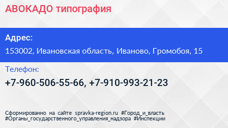 АВОКАДО, типография по адресу 153002, Ивановская область, Иваново, Громобоя, 15 в дальнейшем Организация, размещена в следующих категориях: