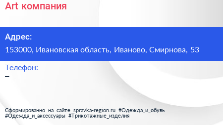 Art, компания по адресу 153000, Ивановская область, Иваново, Смирнова, 53 в дальнейшем Организация, размещена в следующих категориях: