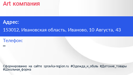 Art, компания по адресу 153012, Ивановская область, Иваново, 10 Августа, 43 в дальнейшем Организация, размещена в следующих категориях: