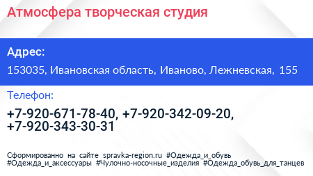 Атмосфера, творческая студия по адресу 153035, Ивановская область, Иваново, Лежневская, 155 в дальнейшем Организация, размещена в следующих категориях: