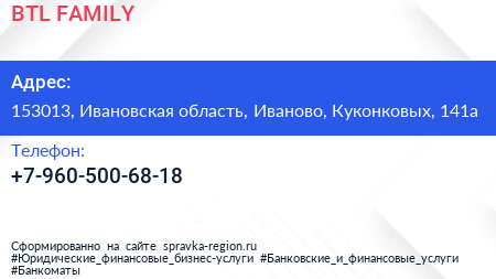 BTL FAMILY по адресу 153013, Ивановская область, Иваново, Куконковых, 141а в дальнейшем Организация, размещена в следующих категориях: