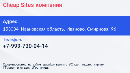 Cheap Sites, компания по адресу 153034, Ивановская область, Иваново, Смирнова, 96 в дальнейшем Организация, размещена в следующих категориях: