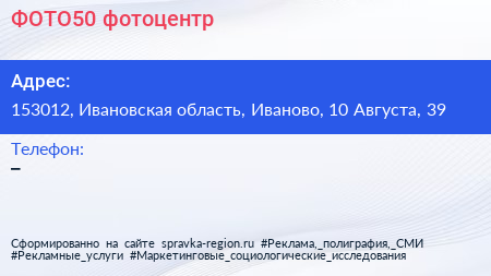 ФОТО50, фотоцентр по адресу 153012, Ивановская область, Иваново, 10 Августа, 39 в дальнейшем Организация, размещена в следующих категориях: