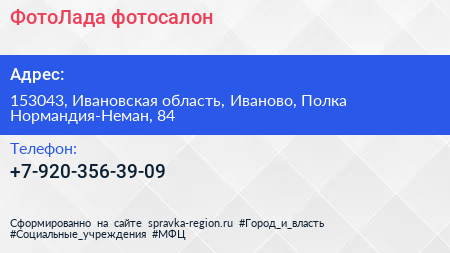 ФотоЛада, фотосалон по адресу 153043, Ивановская область, Иваново, Полка Нормандия-Неман, 84 в дальнейшем Организация, размещена в следующих категориях: