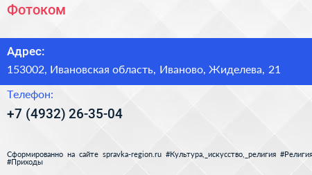 Фотоком по адресу 153002, Ивановская область, Иваново, Жиделева, 21 в дальнейшем Организация, размещена в следующих категориях: