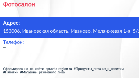 Фотосалон по адресу 153006, Ивановская область, Иваново, Меланжевая 1-я, 5/1 в дальнейшем Организация, размещена в следующих категориях: