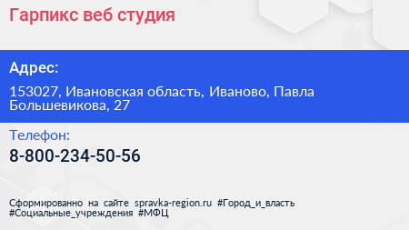 Гарпикс, веб-студия по адресу 153027, Ивановская область, Иваново, Павла Большевикова, 27 в дальнейшем Организация, размещена в следующих категориях: