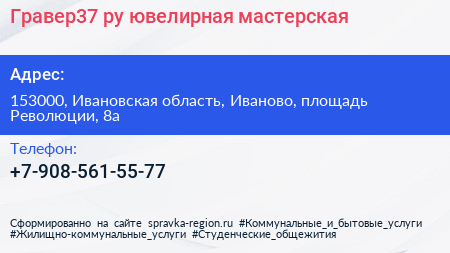 Гравер37.ру, ювелирная мастерская по адресу 153000, Ивановская область, Иваново, площадь Революции, 8а в дальнейшем Организация, размещена в следующих категориях: