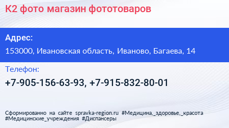 К2 фото, магазин фототоваров по адресу 153000, Ивановская область, Иваново, Багаева, 14 в дальнейшем Организация, размещена в следующих категориях: