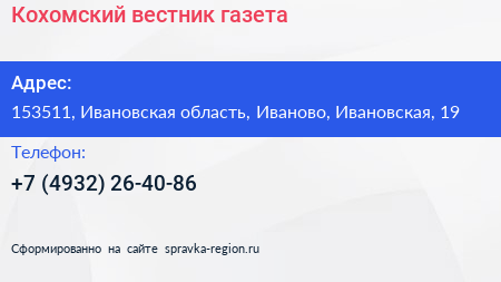 Кохомский вестник, газета по адресу 153511, Ивановская область, Иваново, Ивановская, 19 в дальнейшем Организация, размещена в следующих категориях: