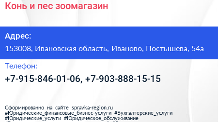 Конь и пес, зоомагазин по адресу 153008, Ивановская область, Иваново, Постышева, 54а в дальнейшем Организация, размещена в следующих категориях: