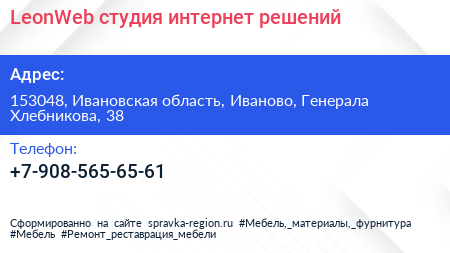LeonWeb, студия интернет-решений по адресу 153048, Ивановская область, Иваново, Генерала Хлебникова, 38 в дальнейшем Организация, размещена в следующих категориях: