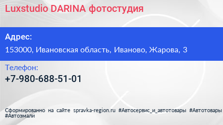 Luxstudio DARINA, фотостудия по адресу 153000, Ивановская область, Иваново, Жарова, 3 в дальнейшем Организация, размещена в следующих категориях: