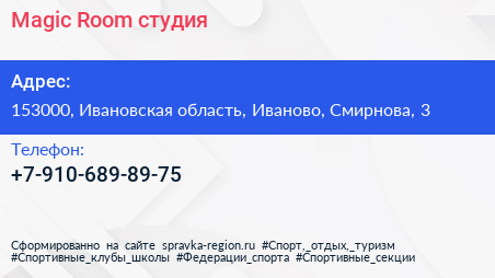 Magic Room, студия по адресу 153000, Ивановская область, Иваново, Смирнова, 3 в дальнейшем Организация, размещена в следующих категориях:
