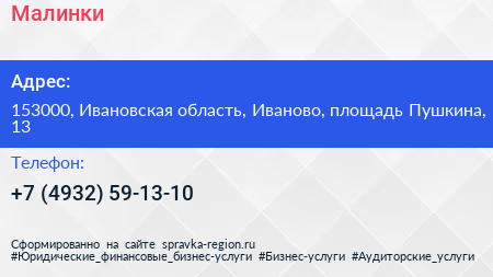 Малинки по адресу 153000, Ивановская область, Иваново, площадь Пушкина, 13 в дальнейшем Организация, размещена в следующих категориях: