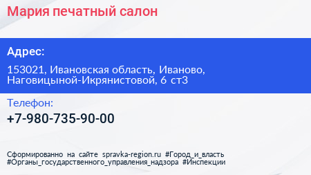 Мария, печатный салон по адресу 153021, Ивановская область, Иваново, Наговицыной-Икрянистовой, 6 ст3 в дальнейшем Организация, размещена в следующих категориях: