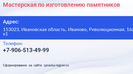 Мастерская по изготовлению памятников по адресу 153023, Ивановская область, Иваново, Революционная, 16а к1 в дальнейшем Организация, размещена в следующих категориях: