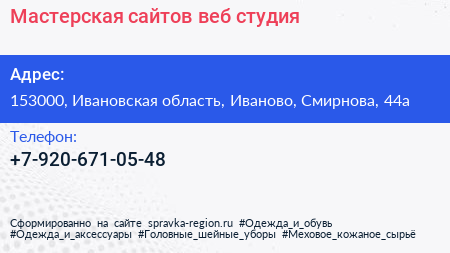 Мастерская сайтов, веб-студия по адресу 153000, Ивановская область, Иваново, Смирнова, 44а в дальнейшем Организация, размещена в следующих категориях: