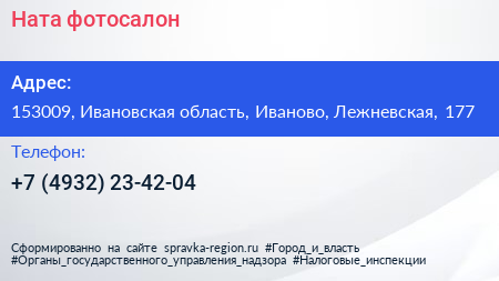 Ната, фотосалон по адресу 153009, Ивановская область, Иваново, Лежневская, 177 в дальнейшем Организация, размещена в следующих категориях: