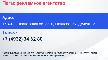 Пегас, рекламное агентство по адресу 153002, Ивановская область, Иваново, Жиделева, 21 в дальнейшем Организация, размещена в следующих категориях:
