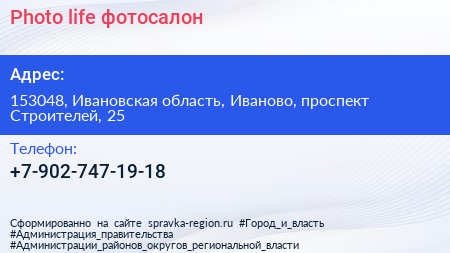 Photo life, фотосалон по адресу 153048, Ивановская область, Иваново, проспект Строителей, 25 в дальнейшем Организация, размещена в следующих категориях: