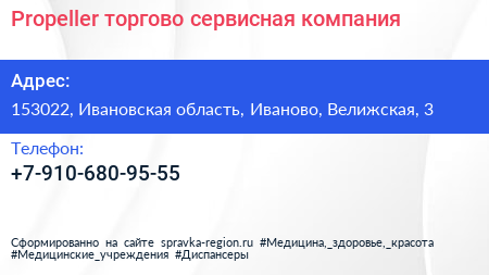 Propeller, торгово-сервисная компания по адресу 153022, Ивановская область, Иваново, Велижская, 3 в дальнейшем Организация, размещена в следующих категориях: