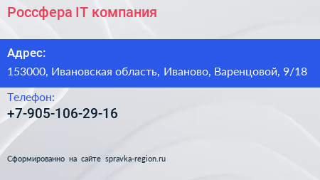 Россфера, IT-компания по адресу 153000, Ивановская область, Иваново, Варенцовой, 9/18 в дальнейшем Организация, размещена в следующих категориях: