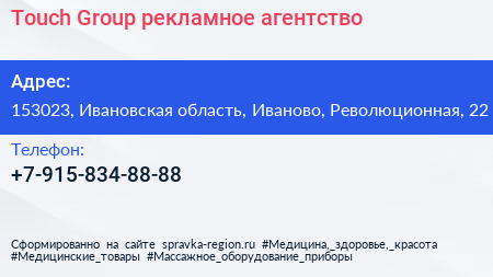 Touch Group, рекламное агентство по адресу 153023, Ивановская область, Иваново, Революционная, 22 в дальнейшем Организация, размещена в следующих категориях: