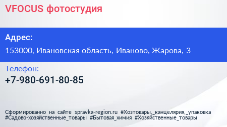 VFOCUS, фотостудия по адресу 153000, Ивановская область, Иваново, Жарова, 3 в дальнейшем Организация, размещена в следующих категориях: