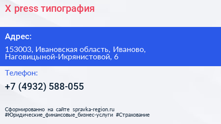 X-press, типография по адресу 153003, Ивановская область, Иваново, Наговицыной-Икрянистовой, 6 в дальнейшем Организация, размещена в следующих категориях: