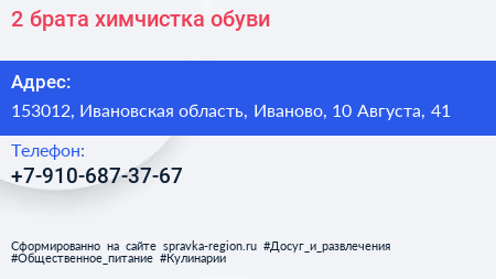 2 брата, химчистка обуви по адресу 153012, Ивановская область, Иваново, 10 Августа, 41 в дальнейшем Организация, размещена в следующих категориях: