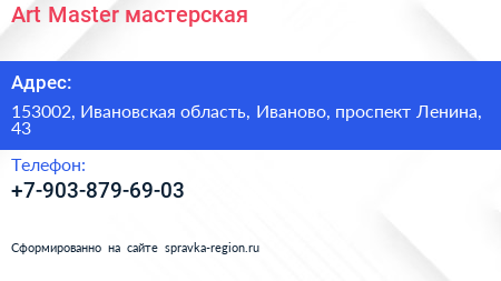 Art Master, мастерская по адресу 153002, Ивановская область, Иваново, проспект Ленина, 43 в дальнейшем Организация, размещена в следующих категориях: