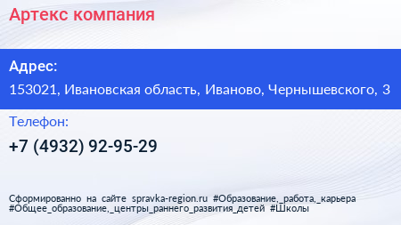 Артекс, компания по адресу 153021, Ивановская область, Иваново, Чернышевского, 3 в дальнейшем Организация, размещена в следующих категориях: