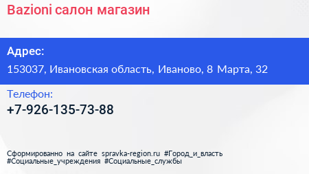 Bazioni, салон-магазин по адресу 153037, Ивановская область, Иваново, 8 Марта, 32 в дальнейшем Организация, размещена в следующих категориях:
