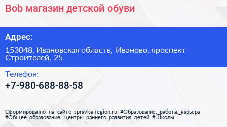 Bob, магазин детской обуви по адресу 153048, Ивановская область, Иваново, проспект Строителей, 25 в дальнейшем Организация, размещена в следующих категориях: