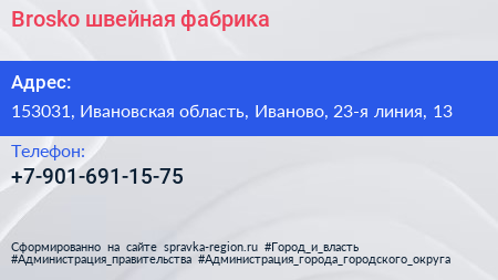 Brosko, швейная фабрика по адресу 153031, Ивановская область, Иваново, 23-я линия, 13 в дальнейшем Организация, размещена в следующих категориях: