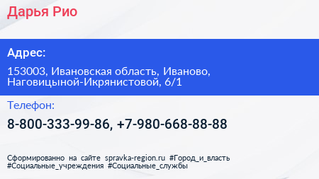 Дарья-Рио по адресу 153003, Ивановская область, Иваново, Наговицыной-Икрянистовой, 6/1 в дальнейшем Организация, размещена в следующих категориях: