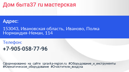 Дом-быта37.ru, мастерская по адресу 153043, Ивановская область, Иваново, Полка Нормандия-Неман, 114 в дальнейшем Организация, размещена в следующих категориях: