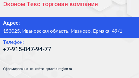 Эконом-Текс, торговая компания по адресу 153025, Ивановская область, Иваново, Ермака, 49/1 в дальнейшем Организация, размещена в следующих категориях: