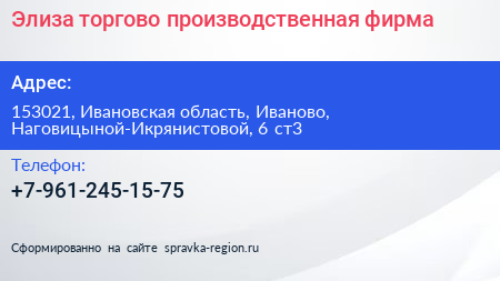 Элиза, торгово-производственная фирма по адресу 153021, Ивановская область, Иваново, Наговицыной-Икрянистовой, 6 ст3 в дальнейшем Организация, размещена в следующих категориях: