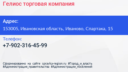 Гелиос, торговая компания по адресу 153005, Ивановская область, Иваново, Спартака, 15 в дальнейшем Организация, размещена в следующих категориях: