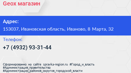 Geox, магазин по адресу 153037, Ивановская область, Иваново, 8 Марта, 32 в дальнейшем Организация, размещена в следующих категориях: