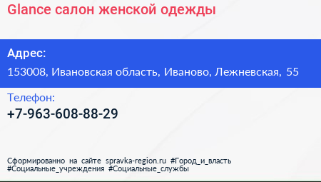 Glance, салон женской одежды по адресу 153008, Ивановская область, Иваново, Лежневская, 55 в дальнейшем Организация, размещена в следующих категориях: