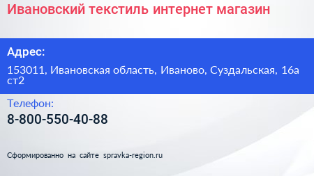Ивановский текстиль, интернет-магазин по адресу 153011, Ивановская область, Иваново, Суздальская, 16а ст2 в дальнейшем Организация, размещена в следующих категориях: