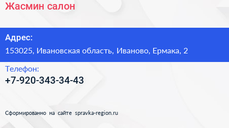 Жасмин, салон по адресу 153025, Ивановская область, Иваново, Ермака, 2 в дальнейшем Организация, размещена в следующих категориях: