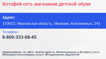 Котофей, сеть магазинов детской обуви по адресу 153013, Ивановская область, Иваново, Куконковых, 141 в дальнейшем Организация, размещена в следующих категориях:
