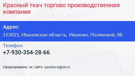 Красный ткач, торгово-производственная компания по адресу 153021, Ивановская область, Иваново, Поляковой, 8Б в дальнейшем Организация, размещена в следующих категориях: