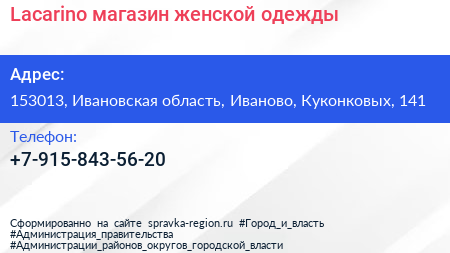Lacarino, магазин женской одежды по адресу 153013, Ивановская область, Иваново, Куконковых, 141 в дальнейшем Организация, размещена в следующих категориях: